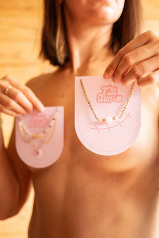 La collection"Check tes boobs" a été imaginée pour célébrer la féminité, la tendresse et le courage. Des colliers délicats, en acier inoxydable, ornés de quartz rose, pierre de l’amour et de la douceur, accompagnés d’un cœur en cristal Swarovski.